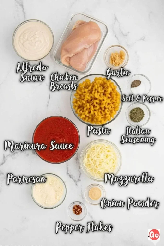 The secret is the sauce combo — marinara and Alfredo together. Before you raise an eyebrow, hear me out. It’s basically a homemade “pink sauce” that’s velvety, rich, and has just enough tang to balance the creaminess. It’s almost like a more accessible version of those Olive Garden chicken pasta crockpot recipes that everyone’s been obsessing over. That same comfort-food energy, but made entirely in your kitchen without leaving the house.
