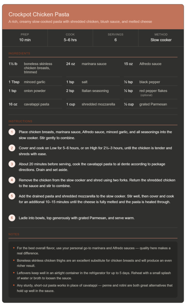 Oh, absolutely yes. If you want to lean into that crockpot garlic parmesan chicken pasta direction, all you need to do is bump up the garlic a bit, skip the marinara, and go heavy on the Alfredo instead. Finish with an obscene amount of Parmesan on top and you’ve got a whole different vibe — still creamy, still slow-cooked, but more buttery and garlicky than tomatoey. Both versions are incredible. It just depends on your mood that day.