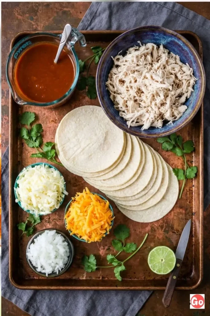 The magic is in the ratio — sauce to cheese to chicken. Too many recipes skimp on the enchilada sauce, and then you end up with these weirdly dry tortilla rolls that taste more like a burrito that gave up on itself. This recipe doesn’t do that. The filling gets sauced, the pan gets sauced, and then everything gets sauced again on top. Drenched in flavor. That’s the goal.