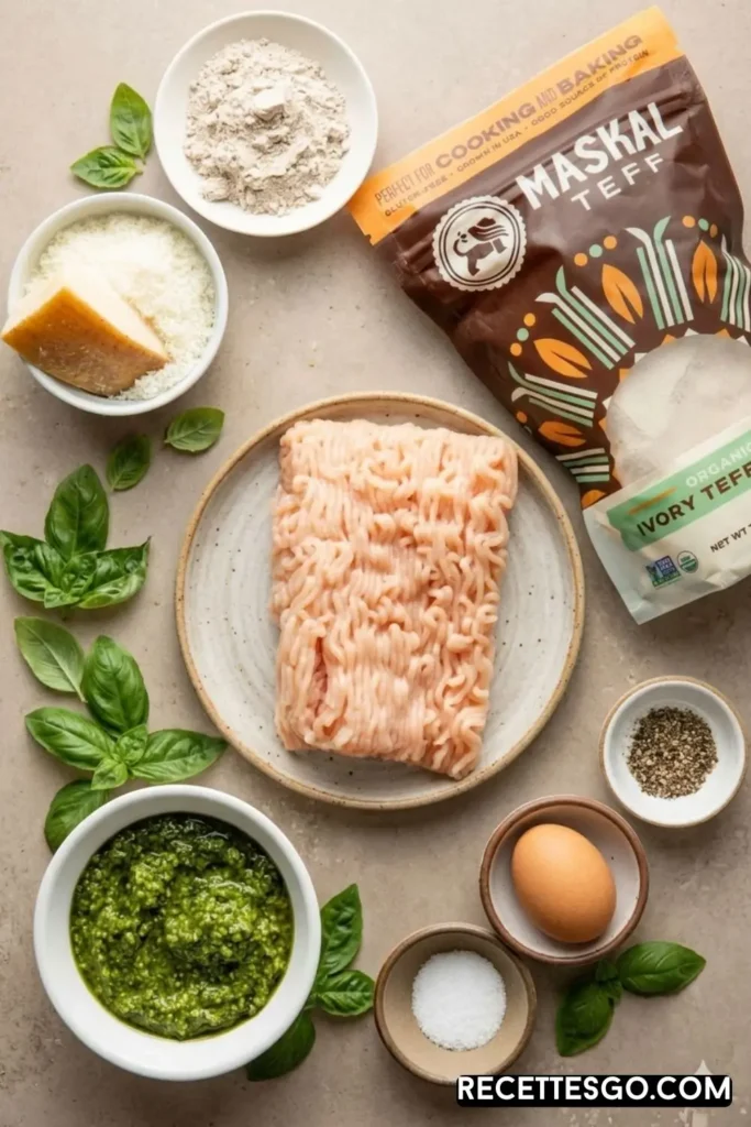 - Mix the meatball mixture: In a medium mixing bowl, combine 2 pounds lean ground chicken, 3.8 ounces prepared pesto (scant ½ cup), 0.5 cups grated Parmesan cheese, 3 tablespoons Maskal Ivory Teff Flour, 1 large egg, 0.5 teaspoons fine salt, and 0.3 teaspoons black pepper. Stir thoroughly with a spoon, or use your hands to mix until everything is evenly combined.