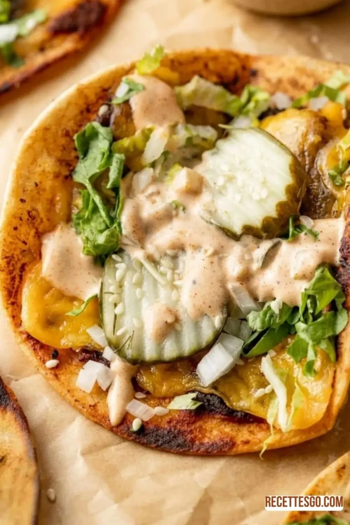- Assemble and serve: Top each taco with 2–3 slices of 18 dill pickle slices (2–3 per taco), a handful of 2 cups romaine or iceberg lettuce, thinly sliced, a spoonful of 0.5 cup diced tomatoes, and a pinch of 0.3 cup white onion, finely diced. Finish with a generous drizzle of the chilled burger sauce (about 1 tablespoon per taco). Fold and serve immediately.