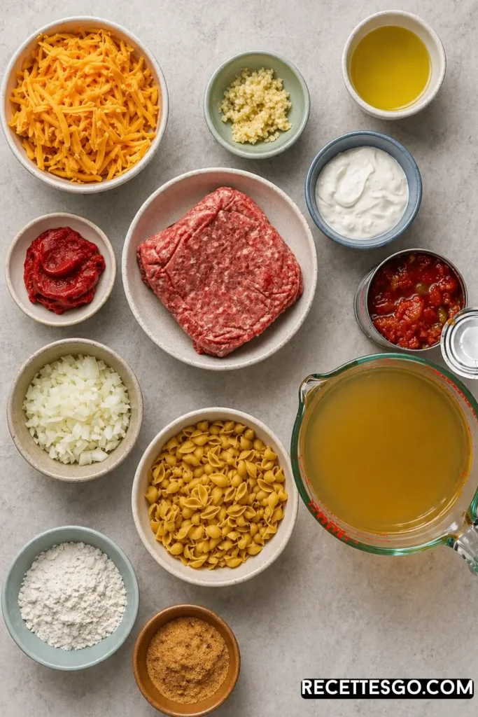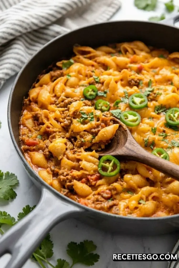 Glad you asked! It’s exactly what it sounds like, and somehow it’s even better than you’re imagining. Think: all the bold, smoky, slightly spicy flavors of taco night — the seasoning, the beef, the tomatoes — but wrapped up in a creamy, cheesy pasta sauce that coats every single noodle.